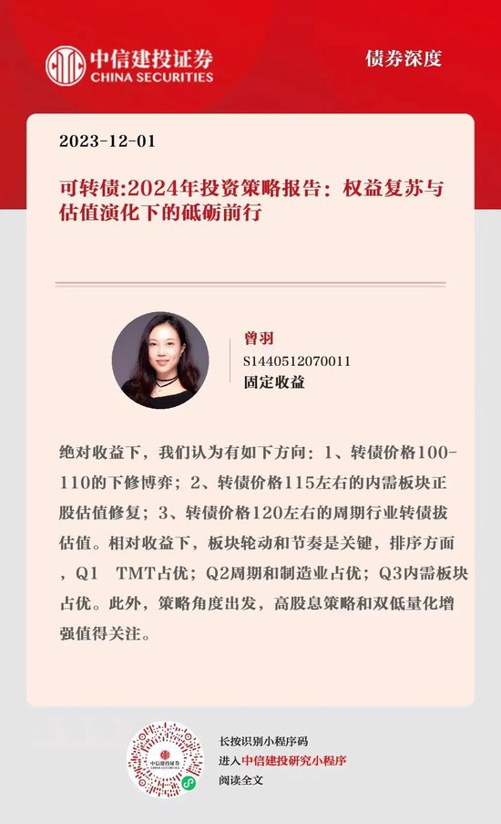 从23年的转债投资来看,板块的选择和策略的应用占优。展望24年,绝对收益下,我们认为有如下方向:1、转债价格100-110的下修博弈;2、转债价格115左右的内需板块正股估值修复;3、转债价格120左右的周期行业转债拔估值。相对收益下,板块轮动和节奏是关键,排序方面,Q1 TMT占优;Q2周期和制造业占优;Q3内需板块占优。此外,策略角度出发,高股息策略和双低量化增强值得关注。