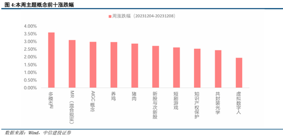 融资余额持续回升,AI板块重新活跃。本周沪深两市主板成交额维持在8000亿以上,内外流动性有所改善。两市融资余额持续增长至16697.28 亿元。市场主题概念方面,AI相关板块涨势良好,具体来看,本周市场主题概念涨幅前十主要在AI板块,美国AI初创公司Pika labs发布首款文生视频产品Pika1.0,昆仑万维正式发布天工SkyAgents平台,谷歌发布多模态大模型Gemini,AI应用得到验证,多模态AI、MR(混合现实)、AIGC相关概念涨幅居前。