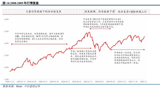 伴随着信贷宽松,稳经济一揽子政策颁布,2009年经济基本面持续上行,A股开启大牛市。1月14日-2月25日十大产业振兴规划相继出台,CPI同比降至-1.6%,企业利润同比触底,降至-37.27%,1月增加人民币贷款1.62万亿元,同比多增8141亿元,信贷同比上行至24.17%;3月12日,2月增加人民币贷款1.62万亿元,同比多增8141亿元;4月11日一季度新增人民币贷款4.58亿,CPI同比降至-1.5%,信贷同比上行至29.72%。