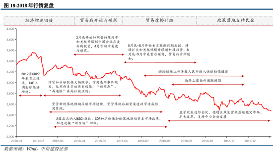 2018年,中美贸易摩擦深刻影响民营企业经营状况与进出口贸易,进一步影响中国经济进入下行区间。2018年9月,官方多次表示支持民营经济,9月PMI降至50.8,社融同比11.21%,CPI上行至年内次高值2.5%,出口同比增长14.5%;10月7日央行宣布10月15日起降准1%,10月19日刘鹤与二行两会负责人对资本市场表态,10月PMII降至50.2持续下行,社融同比10.79%,CPI依然处于高位;11月1日,习主席主持召开民营企业座谈会,11月5日宣布将设立科创板并试点注册制,11月PMII继续降至50接近荣枯线,CPI降至2.2%通胀有所缓解,社融同比降至10.31%;12月PMI49.4首次降至荣枯线以下,CPI持续降至1.9%,社融降幅缩小。