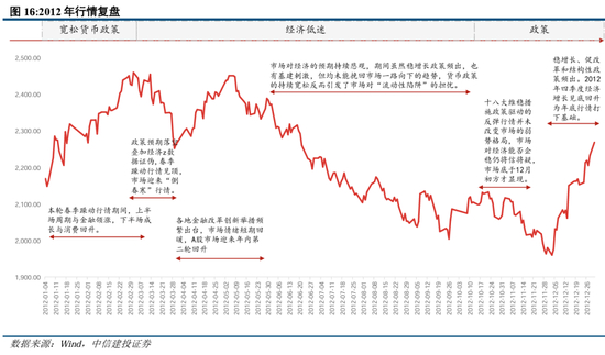 2012年,A股阶段反弹,受益于年初的宽松政策,市场快速回弹走高,行情结束于两会对房地产的管控政策及政府换届带来的政策预期不确定性,最终在年末由中央经济工作会议颁布六大任务,放松境内企业境外发行股票和上市条件完成了对市场预期的大幅提振,形成翘尾行情。1月6日深化新股发行制度市场化改革,提振股市信心,工业企业利润累计同比25.35%,CPI当月同比4.07%;2月18日央行宣布再次降准,2月末工业企业利润累计同比-5.20%;3月14日两会期间表示今年经济形势严峻,房地产调控不放松,随后A股实现12年第一次双头。