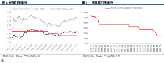 四季度以来,同业存单收益率与DR007利率渐行渐远,原因如下:1)8月以来资金面的持续偏紧状态。2)商业银行,特别是国有行的负债端压力。特殊再融资债、增发国债发行放量,而大行和股份行作为政府债的主要承接者,迫使大行通过主动负债发行存单的方式补充流动性。3)2023年11月金融监督管理总局正式发布《商业银行资本管理办法》,提到商业银行投资于3个月以上期限的同业存单的风险权重明显上升,可能导致商业银行更倾向于持有三个月期以下的同业存单,带动同业存单期限利差走阔。
