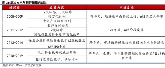 我们选择了历史上四个典型的岁末偏弱行情,来复盘政策预期扭转如何影响市场完成熊市到牛市的转变,分别是2008-2009年(基本面改善牛市);2018-2019年(结构性牛市);2011-2012年(政策作用有限,阶段反弹);2013-2014年(政策调整期,熊牛拐点出现较晚)。