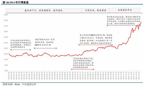 2014年,由于13年“钱荒”负面影响持续存在,市场对流动性预期较低,同时基本面持续冷淡,CPI和PPI数据无法支撑,年初市场投资谨慎。14年前两个季度,政策力度有限,经济基本面维持13年年末水平。1月7日,保监会放行保险资金投资创业板股票,1月17日,时隔1年多A股IPO重启;2月18-20日人民币汇率累积下跌154个基点;3月21日,证监会发布《优先股试点管理办法》,一季度GDP同比增长7.5%,PPI连续三月同比下滑,企业利润略有下滑,新增人民币存款47200亿。6月央行定向降准,不断向市场释放宽松信号,11月首次降息之后市场情绪开始回暖,并在年末形成翘尾行情。