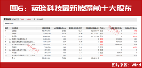 社保基金114组合则对蓝晓科技继续持股不变。而与此同时,与三季度末相比,基本养老保险基金一零六二二组合与一零六二一组合对蓝晓科技的持股数量均有不同程度的增加。11月27日登记在册的数据显示,两只产品分别位居公司第六大和第十大股东(见图6)。