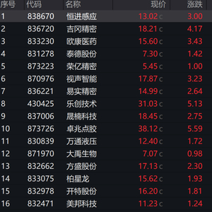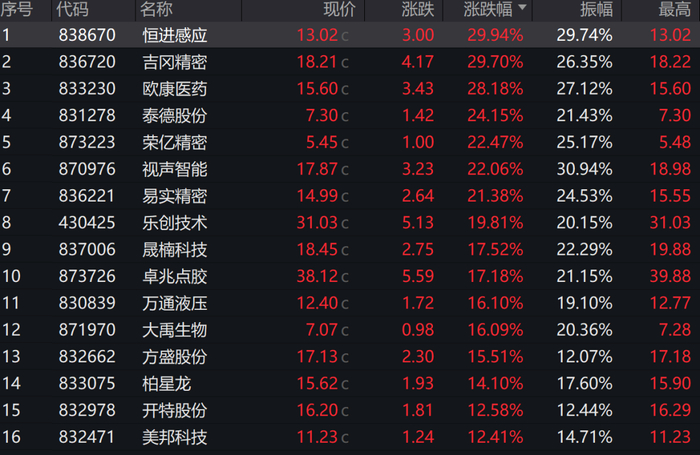 截至收盘,北证50指数上涨4.04%,报收1032.93点,单日成交金额达到153.66亿元;北交所238只个股仅有2只收跌,恒进感应“30cm”涨停,吉冈精密逼近涨停,欧康医药、泰德股份、荣亿精密等多只个股涨幅超过20%。