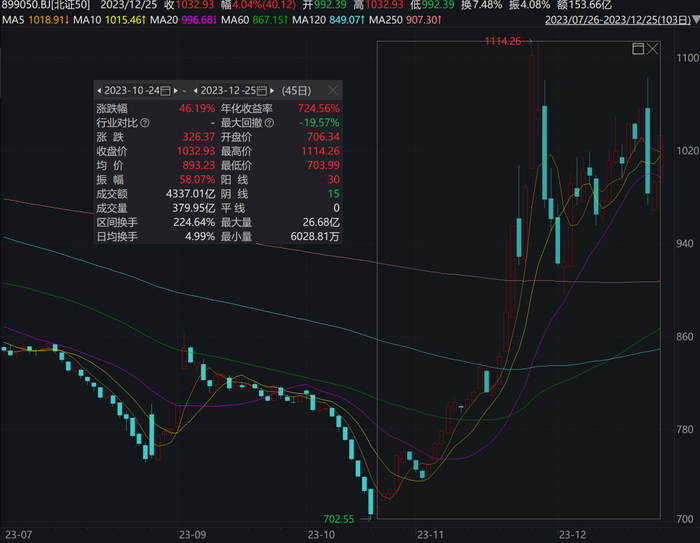 事实上,从10月24日至今,北证50指数涨幅超过46%,此前该指数一度涨至1114.26点的高位,但随后迎来较为猛烈的调整,近期再度震荡上扬。市场关于北交所行情的持续性的讨论,也不绝于耳。