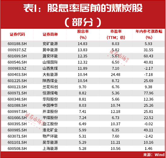进一步来看,统计近40只煤炭股显示,其中有27只股推出了2022年度的分红方案,17只股息率在7%以上,部分个股则超过10%,如兖矿能源、冀中能源、潞安环能、山西焦煤、陕西煤业等。与此同时,具有高股息率的煤炭股当前估值普遍较低,多处于10倍以下(见表1)。