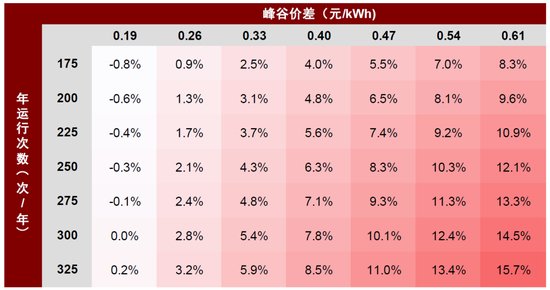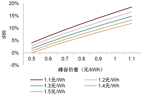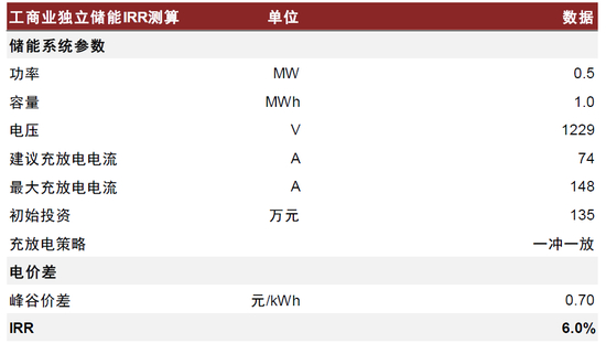 工商业峰谷价差达0.7元/kWh时,一充一放情况下IRR可达6%。我们以0.5MW/1MWh的工商业储能项目为例,假设总投资成本为135万元,系统循环效率90%,充放电深度90%、全年运行330天。则我们测算当峰谷价差在0.7元/kWh时,工商业储能(一充一放)项目IRR可达约6.0%,基本可满足终端业主收益率要求。若峰谷价差提升至1元/kWh、投资成本下降至1.2元/Wh,则项目IRR可超14%。