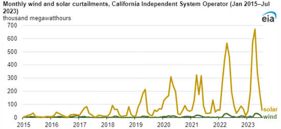 图表8:CAISO月度弃风弃光量(2015年1月-2023年7月)