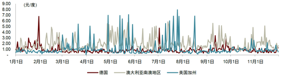 海外高比例VRE发电占比催动电价震荡,储能资产盈利性增强。德国/美国加州/澳大利亚SA地区2023年1-11月平均峰谷价差分别为117欧元/148美元/417澳元/MWh(折合人民币约0.89/1.05/1.96元/度)。我们观察到极端电价的发生频次与波动性可再生能源(VRE)发电占比呈现正相关,同时极端天气现象也会导致极端电价的发生。德国方面,日内电价单日内呈现双峰谷,与VRE发电占比大致呈负相关关系;美国加州7月受到夏季高温天气影响,极端高电价频次增多,9-11月入秋后电价振幅缩窄;澳大利亚南澳地区VRE发电占比高,其中1H23风光发电量合计占比约73%,极端电价相对发生次数最多,最高可达16,600澳元/MWh,最低可达-999澳元/MWh。