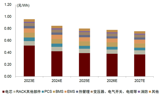 电芯容量提升加强对储能安全性的要求,政策驱动PACK级消防方案渗透。据中国科学院院士欧阳明高表示[9],大容量电池如320Ah电池,内部温度可以超过800度,超过了磷酸铁锂正极分解的温度。高容量发展的趋势促使储能产业进一步提升消防安全设计要求。2023年7月,国家标准《电化学储能电站安全规程》[10]开始实施,其中指出“锂离子电池室/舱自动灭火系统的最小保护单元宜为电池模块,每个电池模块可单独配置灭火介质喷头或探火管”,我们认为该政策或驱动储能行业从舱级消防逐步转变向PACK级消防,带来储能消防壁垒和价值量提升。