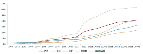 图表14:部分国家2011-2030年风电和光伏发电量占比及预期