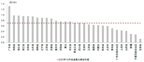 图表19:2023年10月各地区峰谷价差情况