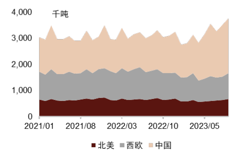 23年三大核心市场需求走势分化。我们观察到,2023年纸浆三大主要消费市场,即中国、欧洲和北美(分别占22年全球商品浆需求约35%、27%和12%)的走势分化明显,其中中国市场需求稳定表现突出,而欧美市场仍较疲软;据PPPC,分目的地看,1-9M23至中国、北美和西欧的商品浆发运量分别同比+24%、-8%和-18%。具体来看: