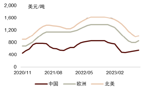 图表7:全球各地区阔叶商品浆价格