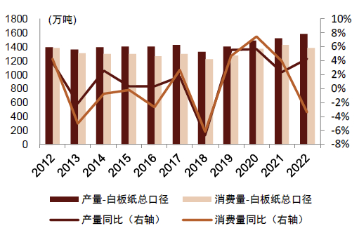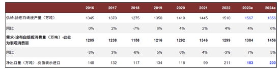 注:此处采用中国造纸协会“涂布白纸板”口径,行业协会并未单独统计“白卡纸”口径,此处包含灰底白+白卡纸