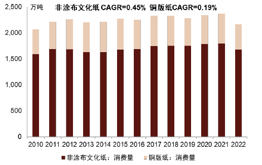 本轮文化纸景气周期能延续吗?文化纸终端需求主要包括教材教辅(每年两轮招投标旺季,分别在春季3-5月,秋季9-11月;“双减”影响有限)、学习教育订单(2023年增量主要来源之一)、期刊/画册/会展等社会类订单,其中2021-22年线下活动偏弱、社会订单略有损耗,历史来看整体消费维持平稳,据中国造纸协会,2010-2022年文化纸消费量CAGR为0.39%,其中双胶纸、铜版纸分别为0.45%、0.19%。整体看,文化纸需求偏刚性,同时在学习教育订单支撑下,2023-24年需求增量亦较明显;供给端看,双胶纸板块集中度仍不高,龙头加速扩产下,有望演绎前期铜版纸格局走向(即加速集中,当前仅个位数市场参与者),我们判断在宏观需求温和复苏背景下,文化纸可能仍然是2024年确定性最高的造纸板块。