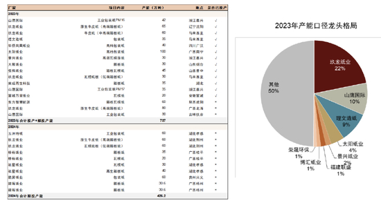 注:统计截至2023年 11月;右图口径为箱板瓦楞纸龙头产能,为我们粗略统计