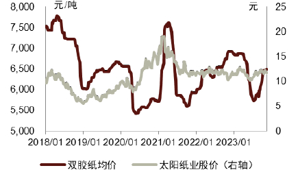 图表19:太阳纸业股价vs双胶纸均价波动