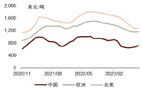 注:针叶浆为北方漂针浆;中国市场为净价(折扣后),欧美市场价格为有效挂牌价格(折扣前)