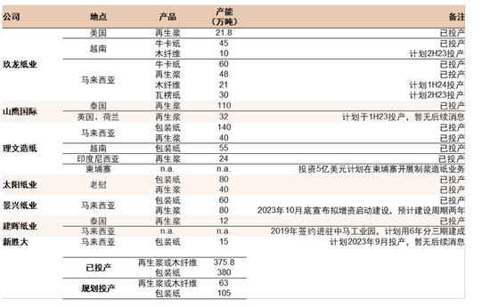 图表31:我国企业在海外投建的包装纸产能梳理(不完全统计;截至2023年11月)