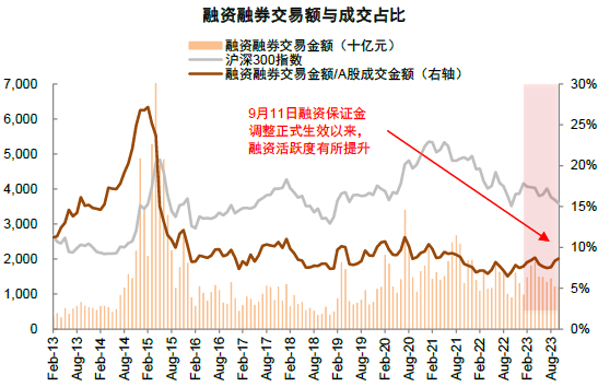 图表:2023年9月以来两融资金交易额占A股成交额比重有所提升