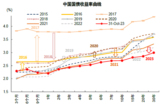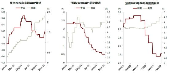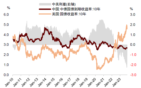 国内宏观流动性有望继续宽松,海外流动性或迎拐点。2023年初至今,十年期国债利率自年初2.9%左右的高位震荡下行至2.65%(截至11月9日),在美联储紧缩和中美利差影响下,相比于我国经济面临的压力,货币政策宽松力度受到一定掣肘。展望2024年,我们认为经济内生增长动能有待进一步改善背景下,货币政策仍有望保持宽松,或推动无风险利率进一步下行。海外方面,2024年美国货币政策方向可能迎来拐点,中美利差对国内货币政策掣肘有望减轻。