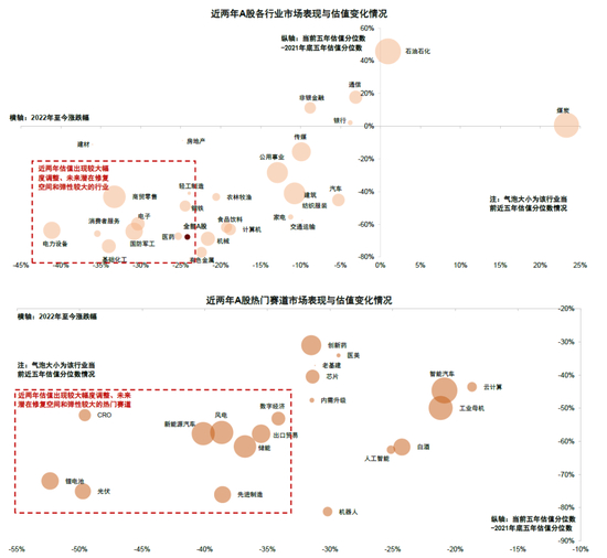 图表:从估值端看,近两年估值出现较大幅度调整、未来潜在修复空间和弹性较大的行业可能包括电子、电力设备、医药,等等