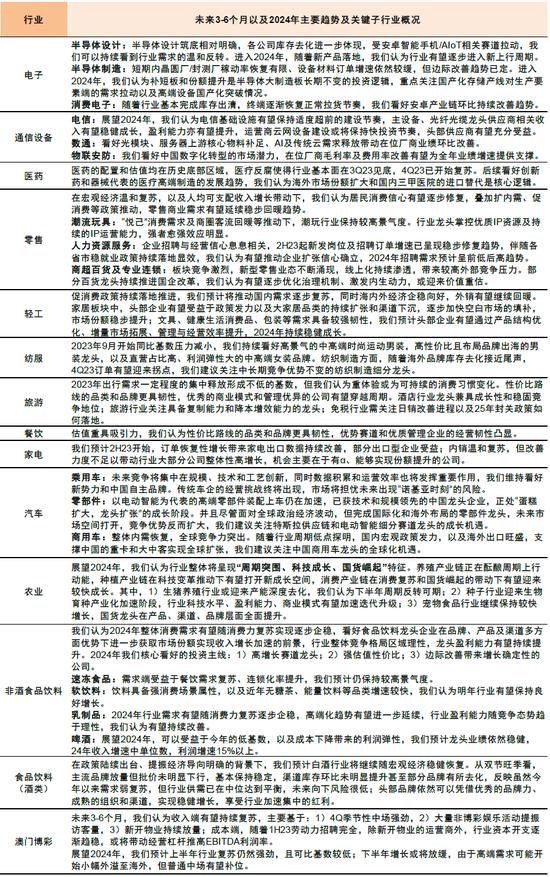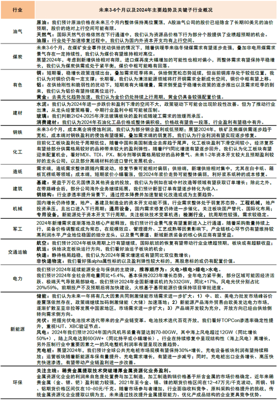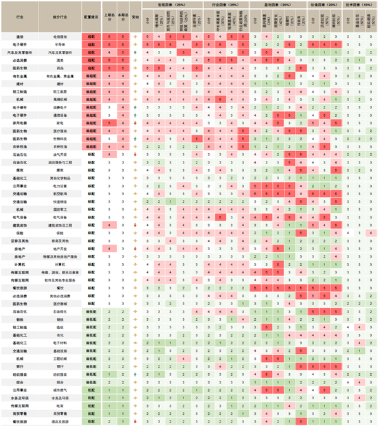 综合对增长及政策的预期、自下而上中金行业分析员的观点,并考虑行业的景气程度及估值等因素,我们更新了行业配置表格。后续仍将根据增长、政策及估值等因素来综合评估及调整配置建议。