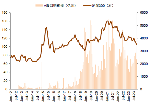 图表:2023年8月以来A股上市公司回购积极性明显提升