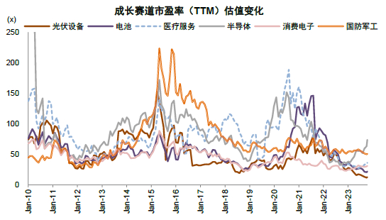 行业分化延续,部分新能源、先进制造、周期板块估值位于历史偏低位。经历调整后,电力设备板块估值基本回到历史区间下限;银行、建筑装饰、通信设备、有色金属、煤炭等行业的估值也较低,低于历史15%分位数;食品饮料、医药生物等外资持仓占比较高的行业估值也远低于历史中值。光伏设备、电池、医疗服务等热门赛道市盈率和市净率估值也已回调至历史较低水平。