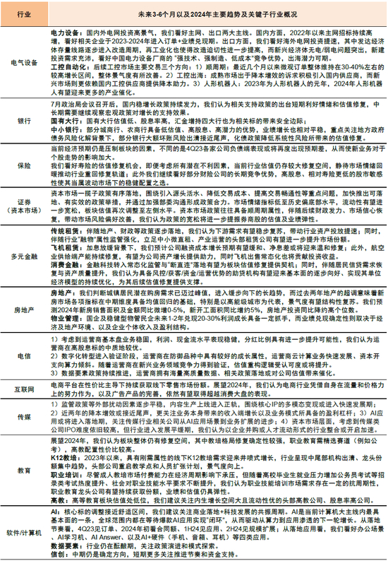 关注6大主题性机会。周期性的波动及结构性的趋势,同时叠加资金面相对宽松,也提供了较多主题性的机会。我们提示未来3-6个月关注如下主题:1)现代化产业体系建设;2)人工智能及数字经济;3)国企改革;4)消费“精细化”;5)“出口链”受益领域;6)超跌优质龙头,等等。
