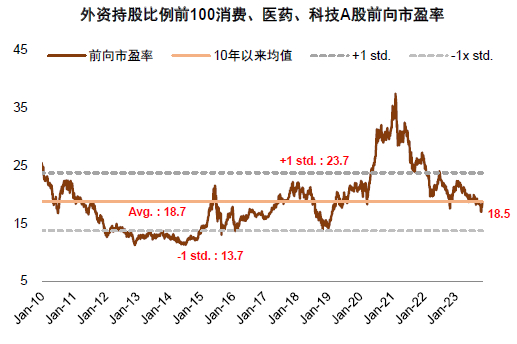 图表:外资持股前100消费、医药、科技指数估值已调整至历史均值附近