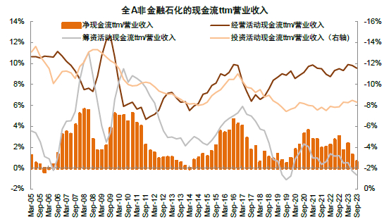 图表:A股非金融石化的筹资活动现金仍然流出,可能影响企业资本周期