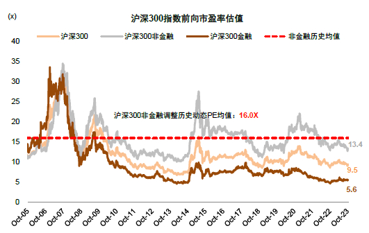 当前A股市场整体估值处于历史低位。截至11月6日,沪深300指数前向市盈率9.5倍,前向市净率1.0倍,明显低于2005年以来的历史均值12.3倍和1.7倍。其中,非金融部分前向市盈率13.4倍,位于历史均值16.0倍向下0.6倍标准差附近;前向市净率1.6x,也位于历史均值2.1倍向下0.6倍标准差。A股市场当前整体估值水平与2019年初、2020年3月以及10月底时期相近。