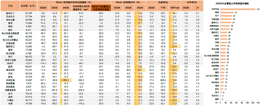 图表:Wind一致预期/中金2024年各行业一致预期盈利增速