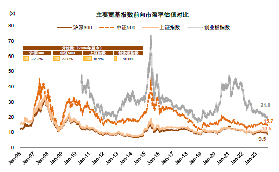 图表:沪深300/中证500/上证指数/创业板指分别位于2006年以来22.2%/22.8%/30.1%/ 10.0%分位