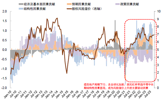 股权风险溢价上升至历史较为极端水平。当前沪深300的股权风险溢价接近历史均值向上1倍标准差,为2009年以来较为极端水平。中美股市股权风险溢价走势分化程度也达2009年以来最高。近年股权风险溢价走高除了经济层面的周期性因素影响,去全球化趋势、经济转型期间的结构性因素也在影响溢价中枢,分解结果显示近年长期结构性因素对股权风险溢价影响有所抬升。2024年,考虑到当前的股权风险溢价已计入过多悲观预期,我们认为伴随内外部影响因素边际改善,有望迎来周期性的均值回归,结合历史数据回测,当前风险溢价水平对应未来6-12个月取得正收益的概率较高。