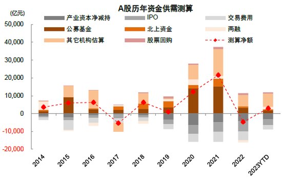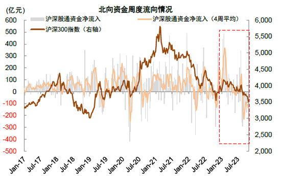 2)北上资金仍可能波动,但有望继续呈现净流入趋势。2023年8月以来在内外部因素综合影响下,北上资金波动较大。截至10月31日,年初至今北向资金净流入A股584亿元。展望后市,考虑我国稳增长政策发力有望改善经济增长预期、美联储加息渐缓、中美互动增多,我们认为北上资金有望从近期净流出逐步重新转为净流入。长期看,外资在A股的配置比例仍有明显提升空间。