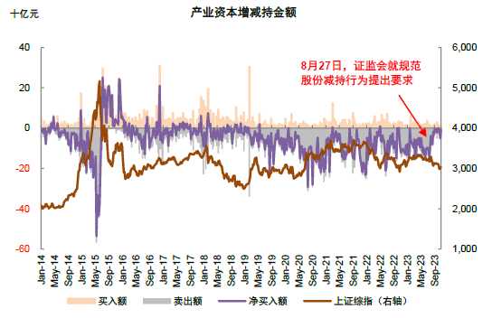 2)股份解禁及减持规模估算:截至2023年10月31日,已经披露的2024年A股市场解禁规模为3.4万亿元,其中2024年8月解禁规模最高(近6000 亿元)。截至10月31日,上市公司净减持规模3100亿元左右,较去年同期略有下降。2023年8月底,证监会就规范股份减持行为提出要求。自9月起,上市公司净减持规模明显回落,9~10月净减持规模合计为150亿元左右,几乎没有新增减持预案。展望2024年,我们认为政策层面或继续引导上市公司根据市场形势合理安排减持节奏。
