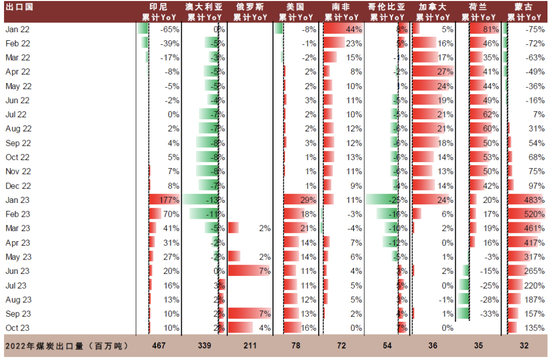 澳大利亚供给能力有望逐步恢复。随着今年以来天气改善,受积水等问题影响露天矿生产逐渐恢复正常,1-10月澳大利亚煤炭出口同比+2.4%至2.88亿吨。往前看,澳大利亚政府部门预计2023年煤炭出口总量将达到3.59亿吨(其中动力煤1.96亿吨、炼焦煤1.63亿吨),较2022年低位水平恢复两千万吨左右,预计2024年出口煤炭3.74亿吨(其中动力煤2.02亿吨、炼焦煤1.72亿吨)。