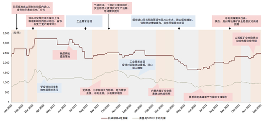 2023年,在需求恢复偏弱,而国内供给继续释放,同时进口大幅增长的背景下,国内煤价较去年的历史高位下移。截至12月8日,秦皇岛5500大卡动力煤现货均价为973元/吨,较2022年的1,273元/吨下跌24%。虽然价格整体呈下行趋势,但其中也有反复,非单边下跌: