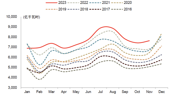 今年以来电力总需求增长平稳。1-11月全社会用电量为83,678亿千瓦时,同比+6.3%(vs. 11M22 YoY 3.5%)。其中第二、第三产业贡献了今年以来全社会用电绝大部分增量。第二产业用电维持稳步增长,1-11月同比+6.1%至55,179亿千瓦时。1-11月二产用电需求占我国用电总量的66%,与二产对社会用电增长的贡献率相匹配。第三产业用电表现更加亮眼,1-11月同比+11.3%至15,120亿千瓦时。1-11月三产用电需求仅占我国用电总量18%,但对社会用电增长的贡献达到30%以上,新兴服务业的快速发展继续在边际上为电力需求提供增长动能。