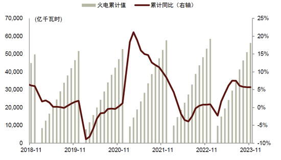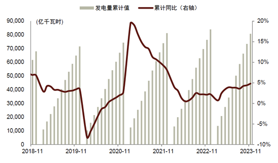 火电增长趋于平稳,水电出力边际改善。1-11月全国发总量同比+4.8%至80,732亿千瓦时,同期火力发电量同比+5.7%至56,178亿千瓦时。8月以前火电保持较快增长动能,主要是受2022年夏季的极端高温、干旱天气影响,主要流域水位相对偏低,导致水电出力不足。不过随着今年8月后水位的改善,水电逐渐向好,火电增速有所回落,1-11月火电累计增速较上半年累计增速收窄1.84ppt。