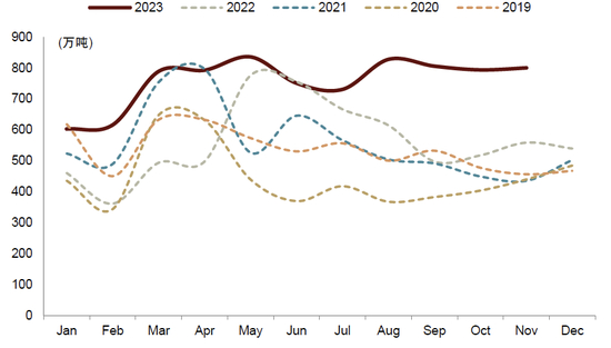► 钢铁出口高位运行,对需求形成支撑。虽然地产下行同样对钢铁需求形成拖累,但钢铁需求韧性更强。1-11月铁水产量同比+1.8%至81,031万吨,日均铁水产量维持相对高位。究其原因,除了基建逆周期调节外,外需较好也是关键。在海内外钢材存在价差下,钢材出口利润较好。1-11月钢材产量同比+2,729万吨或+2.2%至12.5亿吨,出口量同比+2,072万吨或33.4%至8,266万吨,产量增量大部分用于出口。