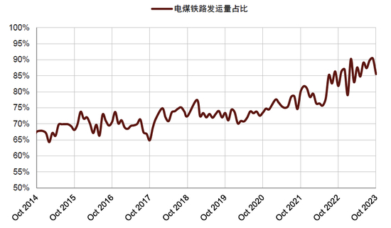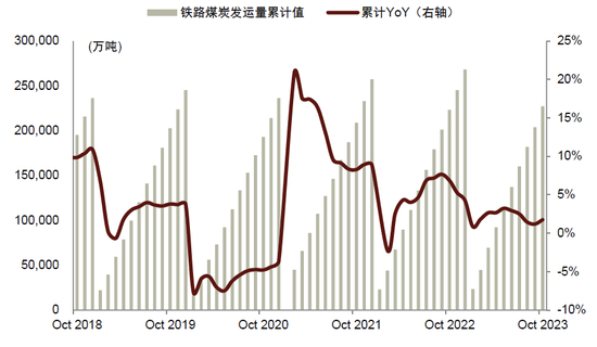 煤炭保供延续,但产量增长持续放缓。今年以来原煤产量继续保持高位,国家统计局数据显示11月原煤日均产量为1,380万吨,1-11月原煤累计产量达42.4亿吨,同比增长2.9%。产量增幅整体呈收窄态势,一方面反映出过去两年产能快速释放后,供给弹性已然有限,另一方面也反映煤矿安全隐患对供给形成了阶段性扰动。从运输角度来看,煤炭铁路发运量占国内煤炭供给的6成左右。今年以来铁路发运量保持增长,但增幅也有所收窄。其中,电煤发运量占煤炭总发运量的比重进一步提升,显示电煤运力保障继续增强,电煤长协覆盖提升,但这也侧面反映出,煤炭供给增量多用于保障长协,非电供给增量可能相对有限。