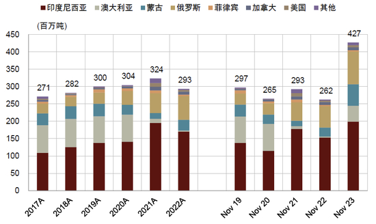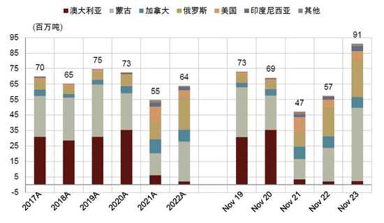 优质主焦煤进口相对有限。澳大利亚是全球主要煤炭出口国,拥有丰富的低硫低灰主焦煤资源。1-11月我国进口澳大利亚炼焦煤同比+5.3%至228万吨,不及历史同期正常水平,一定程度反映该国供应尚未完全恢复且出口结构有所调整。往前看,虽然2024年澳大利亚炼焦煤供应有望增加,但考虑到印度、印尼等地区炼焦煤需求的增长,我国从澳大利亚进口炼焦煤的空间可能相对有限。