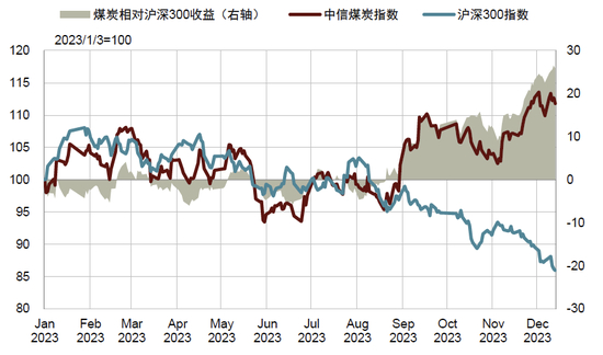 煤炭板块跑赢,集中在三季度后开始发力。今年以来煤炭板块整体延续了跑赢市场的表现,年初至12月15日,板块累计涨幅约12.7%,位居市场前列,跑赢沪深300近24.0ppt。虽然上半年“中特估”等主题概念在部分个股中有所演绎,但市场预期行业整体盈利将随煤价下行继续回落,因此板块表现相对平淡。板块跑赢集中在8月中下旬之后体现,我们认为这一轮行情主要由预期差驱动。