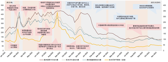 不过,海外煤价在下行之后仍处于相对高位,截至12月8日澳洲纽卡斯尔动力煤价格为144美元/吨,今年以来均价为178美元/吨,对比历史年度来看仍仅次于2022年均价362美元/吨。究其原因,一是需求具备支撑,中国等亚太主要新兴市场的需求仍有增量,同时澳洲天然气工人罢工等事件凸显了海外天然气供给的脆弱性,也为煤炭需求向上的预期提供可能。二是,供给弹性问题并不局限于中国,投资不足、运输条件约束、ESG等因素导致海外煤炭供给增长相对有限。